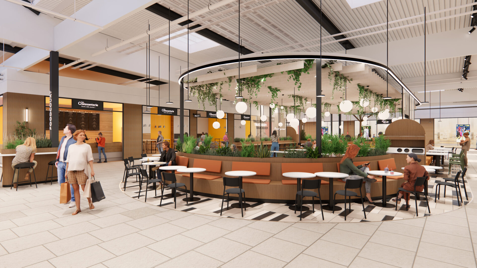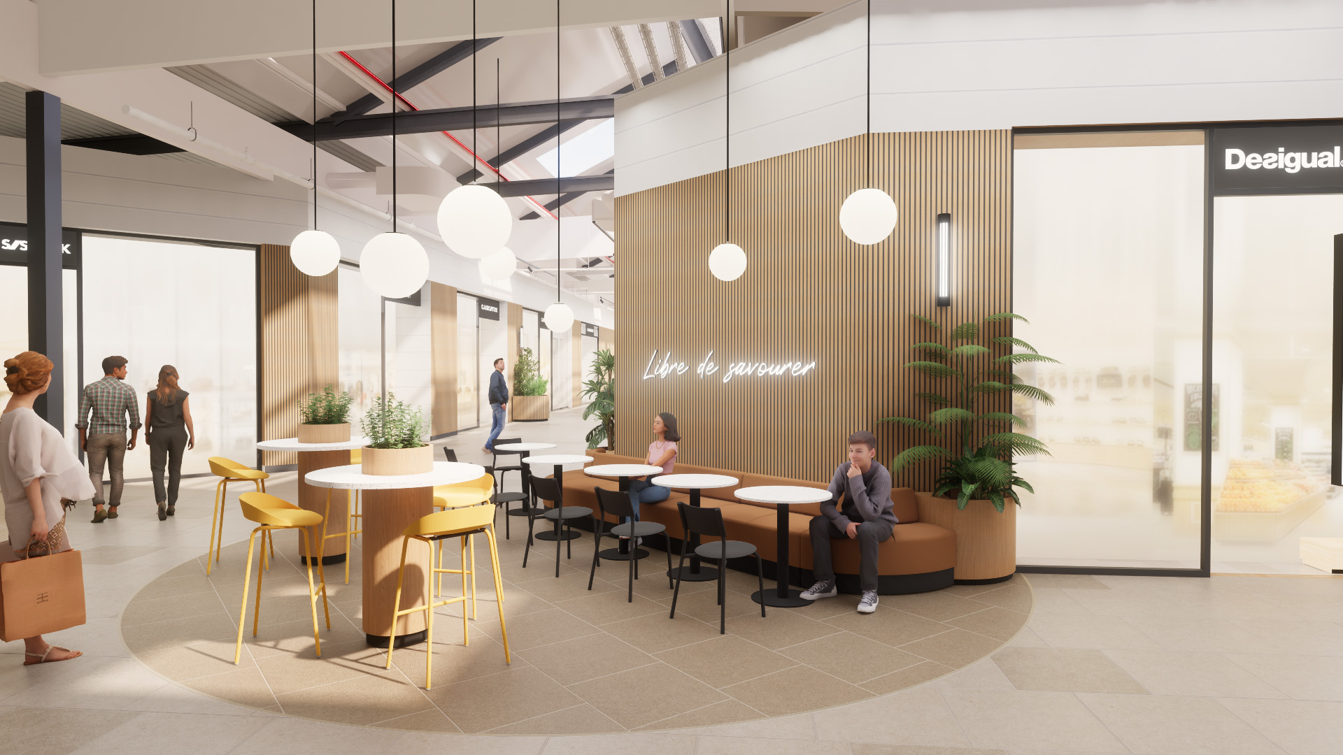 À l’intérieur, l’entrée principale devient une agora modulable, pensée pour accueillir tous les événements. Des espaces de détente et des placettes conviviales sont créés. L’aménagement comprend également un espace enfants, un pôle de services pratiques, et un nouveau pôle restauration